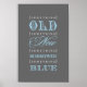 Elegant and vintage "Something old, something new, something borrowed, something new" typography quote design. Display as a welcome sign at a wedding bridal shower. Colours include charcoal grey, white and pale aqua blue.
