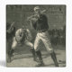 Vintage illustration black and white Victorian Era sports baseball designs featuring a team player at bat and a catcher waiting for the pitcher to pitch the ball, the umpire is watching behind home plate. They are playing a game. "A Ball or a Strike - Which?" by Thure De Thulstrup, 1888.