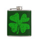 Vintage St Patrick's Day flask with green shamrock. Funny gift idea for your Irish drinking team. Distressed look vector design. Lucky 4 leaf clover for St Pats.