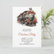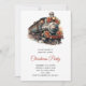 A Christmas party invitation with an illustration of an old vintage steam train. Decorated with red Christmas flowers.