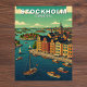 Embrace the maritime charm of Scandinavia with this beautiful Stockholm Travel Card. This vintage-style illustration captures the essence of the Swedish capital, featuring the iconic terracotta and gold-hued buildings of the waterfront, bustling with sailboats and traditional rowing boats in the sparkling blue harbor.