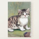 Planner featuring a striped kitten. Black stripes run across a white kitten’s fur. A white flower decorates a basket in a grassy field. A fantastic gift for cat lovers and Victorian art enthusiasts!