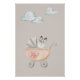 This portrait poster features a sweet bunny sitting in a baby buggy, surrounded by soft watercolor-style clouds in gentle pastel tones. The illustration combines vintage charm with modern simplicity, resulting in a balanced and calming visual. Clean lines and subtle textures give the design a light, whimsical feel while maintaining a neutral appearance.