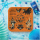 These square paper plates are perfect for your Halloween party. They feature an assortment of vintage style graphics with a witch, black cats, a jack-o-lantern pumpkin, a bat and lots of stars in black cream and orange against an orange background. These plates are ready to be personalized with your own Heading in bold print lettering and your own subtitle in script lettering.