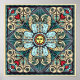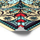 In muted green, aqua, peach, and turquoise, typical of the Art Nouveau period of design, with bright pink accents, a yellow sun surrounded by swirls of paisley, moons and stars, accented with pink hearts. Hand drawn and digitally coloured.