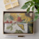 Vintage birds, flowers and butterflies mixed with handwritten letters and typography, in summer colours of yellow, red, blue, green and beige parchment. Script handwriting ephemera is layered softly over the crackle textured image.