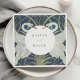 A symbol of eternal love using our Enchanted Swan Love Wedding Paper Napkins. This design is centred around a pair of swans, their necks forming a delicate heart shape, set against a deep, navy blue canvas with flecks of gold. The swans are depicted with meticulous attention to detail, their feathers rendered in shades of white and cream with golden highlights that add a romantic and regal touch. This design is perfect for adding a cohesive and elegant finishing touch to your wedding stationery suite.