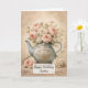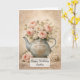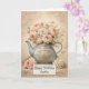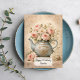 A soft vintage-style illustration featuring a classic teapot filled with blooming pink and white roses. The composition is set against an aged, textured background with lace details, creating a delicate and timeless floral arrangement with a shabby chic aesthetic.