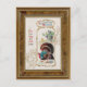 Charming restored vintage Thanksgiving illustration featuring plump turkey, gold rustic border with engraved gold leaves, grapevines and Thanksgiving greeting with wood frame graphic. Back features complementary gold border, complementary background and editable text fields.
