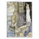 A vintage book illustration by Florence Susan Harrison of "The Lady of Shalott," a poem written by Alfred Lord Tennyson. The Lady, with long, flowing black hair, stands beside an open window in a castle looking out over a vista that includes a river. White doves and colourful ribbons fly around her at the window. The artist, Florence Susan Harrison (1877-1955) was born on board the Windsor Castle, a ship bound from London to Brisbane, Australia. Her father, Norwood Harrison, was a master mariner and ship’s captain, and his family spent much time of their time at sea with him. In between voyages, Florence attended a school run by a great-aunt in Folkestone, England. As an adult, Florence lived in England and for some time in Belgium. She was an Art Nouveau and Pre-Raphaelite illustrator of poetry and children’s books including some books of her own poetry. Following Florence’s death, her artwork was often mistakenly attributed to Emma Florence Harrison, a Victorian-era artist who exhibited at the Royal Academy in the 19th century. To this day, Florence Susan Harrison’s artwork can be found on many Internet art websites incorrectly attributed to Emma Florence Harrison. This card is blank inside for your own message.