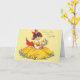 A vintage birthday greeting card image features a young lady, her hair in a ponytail with a red bow. She settles down into the grass so that her lemon-yellow dress with a full skirt and red sash spreads out around her in a circle. She holds a bouquet of wild flowers. The message on the front of the card is "Thinking of You on Your Birthday" and inside the card "Wishing you whatever warms your heart and brings you a smile."