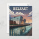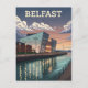 This vintage-style travel poster captures the striking architecture of the Titanic Belfast museum at twilight. The museum's shimmering, angular facade is beautifully reflected in the still waters of the harbour, with a line of streetlights illuminating the waterfront. The sky is a mix of deep blues and warm, glowing clouds, and distant mountains complete the serene evening scene. The retro art style makes this a perfect piece for anyone who loves Belfast, modern architecture, or vintage travel art.