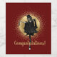 Fun way to say congratulations! Design features vintage photo cutout of woman in dress and top hat dancing on top of bottle of sparkling wine with gold ornate disc on dark red / maroon background and gold customizable text.