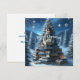 Vintage traditional christmas postcard in christmas fir forest girl holding a present
