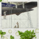 Vintage illustration business travel and transportation design featuring workers or employees up on scaffolding painting the tail of a jumbo jet airliner plane at the airport.