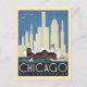 Vintage illustration travel poster advertising from Chicago, Illinois showing the city's skyline with tall buildings and the harbour with boats.