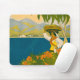 Vintage travel poster for Jamaica, the gem of the tropics, showinga woman standing before a body of water carrying a fruit basket on her head. In the background, mountains and a village. circa 1910.