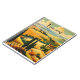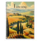 vintage travel poster of the countryside in Tuscany Italy with cypress trees, rolling golden hills and remote houses