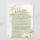 Tropical chic baptism or christening invitations in an alluring neutral colour palette feature a central arched element bearing your church ceremony and celebration or party details, accented with pale green watercolor palm fronds, beachy island foliage, white orchids, boho dried botanicals and pampas grass.