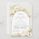 Tropical chic baptism or christening invitations in an alluring neutral colour palette feature a central arched element bearing your church ceremony and celebration or party details, accented with pale green watercolor palm fronds, beachy island foliage, white orchids, boho dried botanicals and pampas grass.
