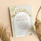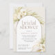 Tropical chic bridal shower invitations in an alluring neutral colour palette feature a central arched element bearing your bridal shower details, accented with pale green watercolor palm fronds, boho island foliage, white orchids, dried botanicals and beachy pampas grass.