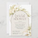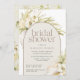 Les invitations à la douche nuptiale chic tropicale dans une palette de couleurs neutres séduisantes comprennent un élément central voûté portant vos détails de douche nuptiale, accentué de frondes de palmier vert pâle, feuillage de l'île boho, orchidées blanches, botaniques séchées et pelouse de plage pampas.