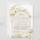Tropical chic baptism or christening invitations in an alluring neutral colour palette feature a central arched element bearing your church ceremony and celebration or party details, accented with pale green watercolor palm fronds, beachy island foliage, white orchids, boho dried botanicals and pampas grass.