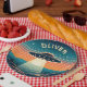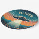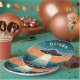 This eye-catching personalized paper plate features a vintage scene of a UFO soaring through a mesmerizing sunset. Stars twinkle in the dark upper sky, while the fiery orange horizon casts a dramatic silhouette on the landscape below. The UFO itself acts as a beacon, illuminating the land with its bright light.