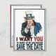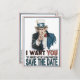 Uncle Sam means business and he's pointing at you to save the date for a wedding, anniversary, graduation, birthday, retirement party, promotion or 4th of July event. Great theme for military functions and patriotic events. Copy of original vintage I Want You Uncle Sam United States war poster.