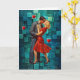 A couple shares an intimate kiss against a geometric blue-green background. The woman wears a red dress, creating a striking contrast.