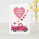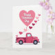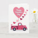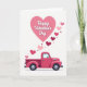 This greeting card features a vintage pickup truck in soft rose pink parked on a bright white background, like it’s just arrived with a sweet delivery ❤️. The truck’s rounded shape and gentle shading give it a cozy, affectionate look, as if it’s carrying a quiet message meant for someone special. From the truck bed, a trail of floating hearts rises upward, starting small and growing larger as they climb. The hearts shift in color from pale blush to deeper crimson, creating a warm gradient that draws your eyes toward the top. Near the top center sits a large pink heart that holds the main text, “Happy Valentine’s Day,” in white lettering. The words are centered inside that big heart, standing out clearly against the pink. A few smaller hearts scatter around it, adding a soft sense of motion 🥰. The final detail is the oversized pink heart at the top with crisp white lettering, framed by a vertical stream of blush-to-crimson hearts below.