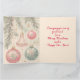 This Christmas card showcases four beautifully detailed ornaments hanging from festive evergreen branches. The ornaments include a pink bell-shaped decoration, a bright pink round ornament, a teal-blue ornament, and another pink one with intricate gold and silver floral patterns. Surrounding the ornaments are glittering gold stars and snowflakes, adding a sparkling, magical touch to the design. The word "Greetings" is written in elegant, golden script at the bottom, enhancing the card's traditional holiday theme. The background has a soft, wintry feel with snow-like accents, capturing the joy and beauty of the Christmas season.