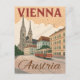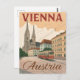 Capture the imperial elegance of the Austrian capital with this vintage-style travel poster postcard. This stunning illustration features the historic architecture of Vienna, including a grand Gothic cathedral (likely St. Stephen's) and a classic red tram moving along a European street. The design uses a muted, antique color palette, giving it a charming retro tourism feel. Perfect for sending a cultural greeting, collecting as a piece of Austria art, or framing for an elegant, wanderlust-inspired display. Ideal for lovers of Europe, classical music, historic cities, and classic retro poster art.