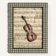 Vintage violin illustration with subtle colouring on background of antique sheet music and harlequin pattern border