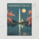 This vintage-style travel poster beautifully captures the iconic Washington D.C. at night during the cherry blossom festival. The design features the towering Washington Monument and the U.S. Capitol Building, with their reflections shimmering in the tranquil Tidal Basin. The foreground is framed by delicate, blooming cherry blossom branches under the soft glow of a full moon.