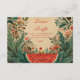 This baby shower design showcases a lush vintage garden illustration with ripe watermelon accents, soft florals, and leafy greenery on a warm parchment background. The composition feels fresh yet nostalgic, blending old-world botanical charm with a playful summer fruit theme.