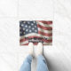 A custom doormat with an image of a vintage, weathered American flag in red, white and blue that you can personalize with your name or text.