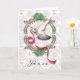 A white dove carries a red ribbon against the backdrop of a green French vintage emblem design. The background is a pink, green, and white damask wallpaper. This is a very feminine card perfect for a refined lady.