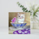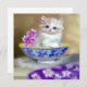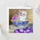 Card featuring a fluffy white kitten! The blue eyed kitten sits in a blue bowl with pink flowers. A purple flowered blanket is draped in front. A marvellous gift for cat lovers and Victorian art enthusiasts!