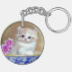 Keychain featuring a fluffy white kitten! The blue eyed kitten sits in a blue bowl with pink flowers. A purple flowered blanket is draped in front. A marvellous gift for cat lovers and Victorian art enthusiasts!