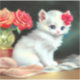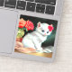 Sticker featuring a white kitten. As the kitten stares with big blue eyes, red flowers adorn its ears. A vase of red roses sits propped next to the white kitten. A wonderful gift for cat lovers and Victorian art enthusiasts!