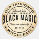 A vintage style potion label for black magic with black text on a beige textured background. This is designed to be used to label a cocktail or decorations at a Halloween party or any other spooky themed event.