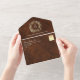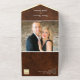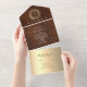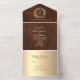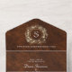This rustic yet elegant all-in-one wedding invitation features a rich wood grain background with a gold monogram crest, floral detailing, and classic script typography. Perfect for fall weddings, country celebrations, or vintage-themed events, this folded invitation adds warmth and charm while simplifying the mailing process. Fully customizable with your details and meal selections.