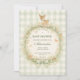 A soft woodland baby shower design featuring a delicate watercolor fawn standing above a floral forest wreath. Gentle greenery, tiny mushrooms, and wildflowers surround the center, while a soft sage gingham background and ribbon bow add a cozy countryside nursery feel. The vintage storybook illustration style and muted woodland palette create an elegant and whimsical design perfect for a nature-inspired celebration welcoming a new baby.