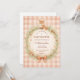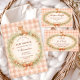 A charming woodland-inspired baby shower design featuring a sweet watercolor fox resting above a delicate floral wreath. Soft greenery, tiny mushrooms, and wildflowers create a cozy forest frame, finished with a warm bow and a soft peach gingham background. The vintage storybook illustration style and gentle earthy palette give the design a whimsical woodland nursery feel, perfect for celebrating a little one in a warm and magical forest setting.