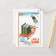 This postcard is a reproduction of a vintage WPA library poster reading "January: A Year of Good Reading Ahead." It shows a child hauling books on a sled through the snow.