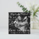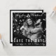 A vinyl record album cover look for your unique save the date. Your photo in black and white covers this square save the date card. Your names are featured at the top in a distinctive script. At the bottom, Save the Date in spacious text and the wedding date and location. On the reverse side, which is white with a black border, you can add or edit several lines of additional text including your wedding website in text and QR code format. All text can be customized by you. Text colour is white. you can also change this in the Design Tool. Photo Tips: this will look best if your faces are centred the photo.