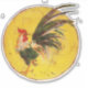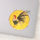 Rooster strutting before a yellow sun. Cockscomb is bright red, feathers are shades of green and oranges. Original ceramic Art by Nora Chen.