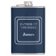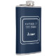 Vinyl wrapped flask is shown in a solid colour of navy blue with a sample father of the bride name.
