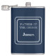 Vinyl wrapped flask is shown in a solid colour of navy blue with a sample father of the groom name.